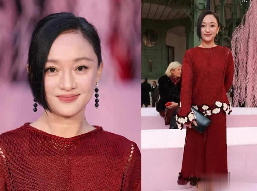 在香奈儿活动当天周迅穿着一身暗红色的针织套装。